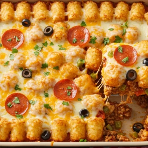 Q: How do I know when my Pizza Tot Casserole is done cooking? A: The casserole is ready when the cheese is completely melted and bubbling around the edges, and the tater tots are golden brown and crispy on top. If you insert a knife into the center, it should feel hot to the touch when removed. If the tots are browning too quickly but the center isn’t hot, cover loosely with foil for the remaining cooking time.